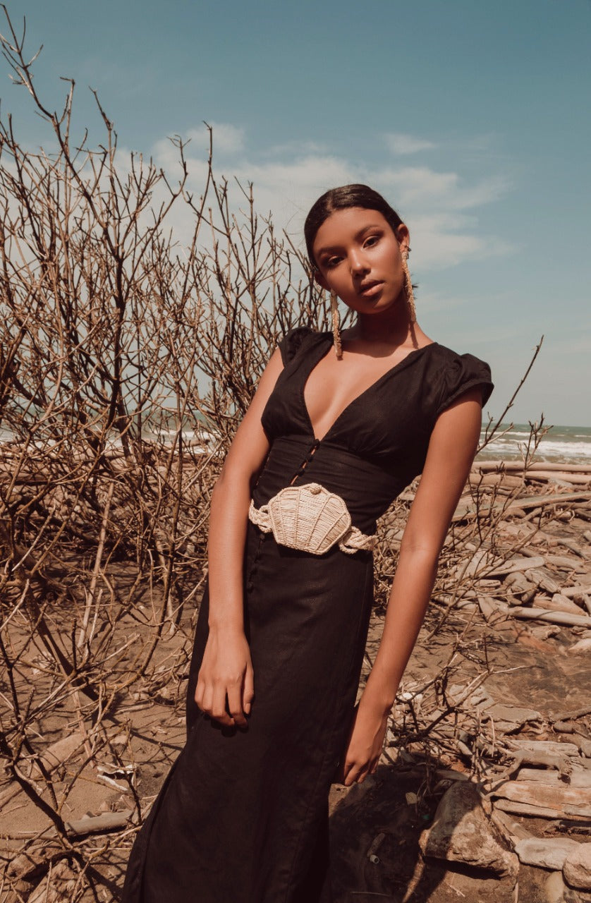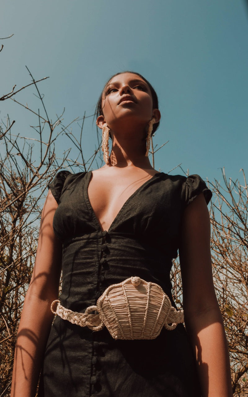 Our Caramali crossbody gag is intricately handwoven into the shape of a seashell from sustainable iraca palm.
