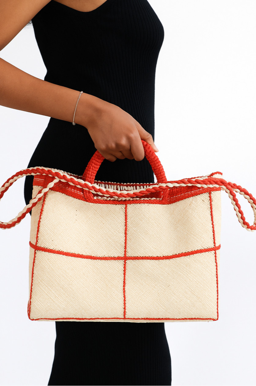 Our Flat-Bottom Grid tote with versatile straps is delicately handwoven from sustainable iraca palm and can stand alone.