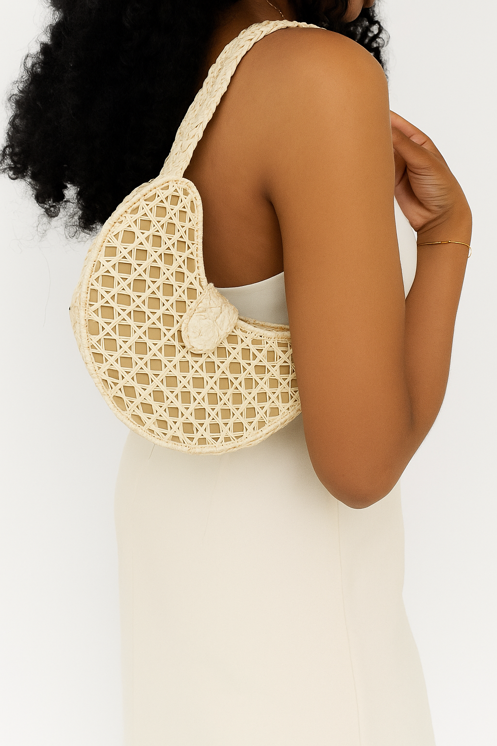 Our Medium Croissant bag w/ woven hand strap is delicately handwoven from sustainable iraca palm and can stand alone.