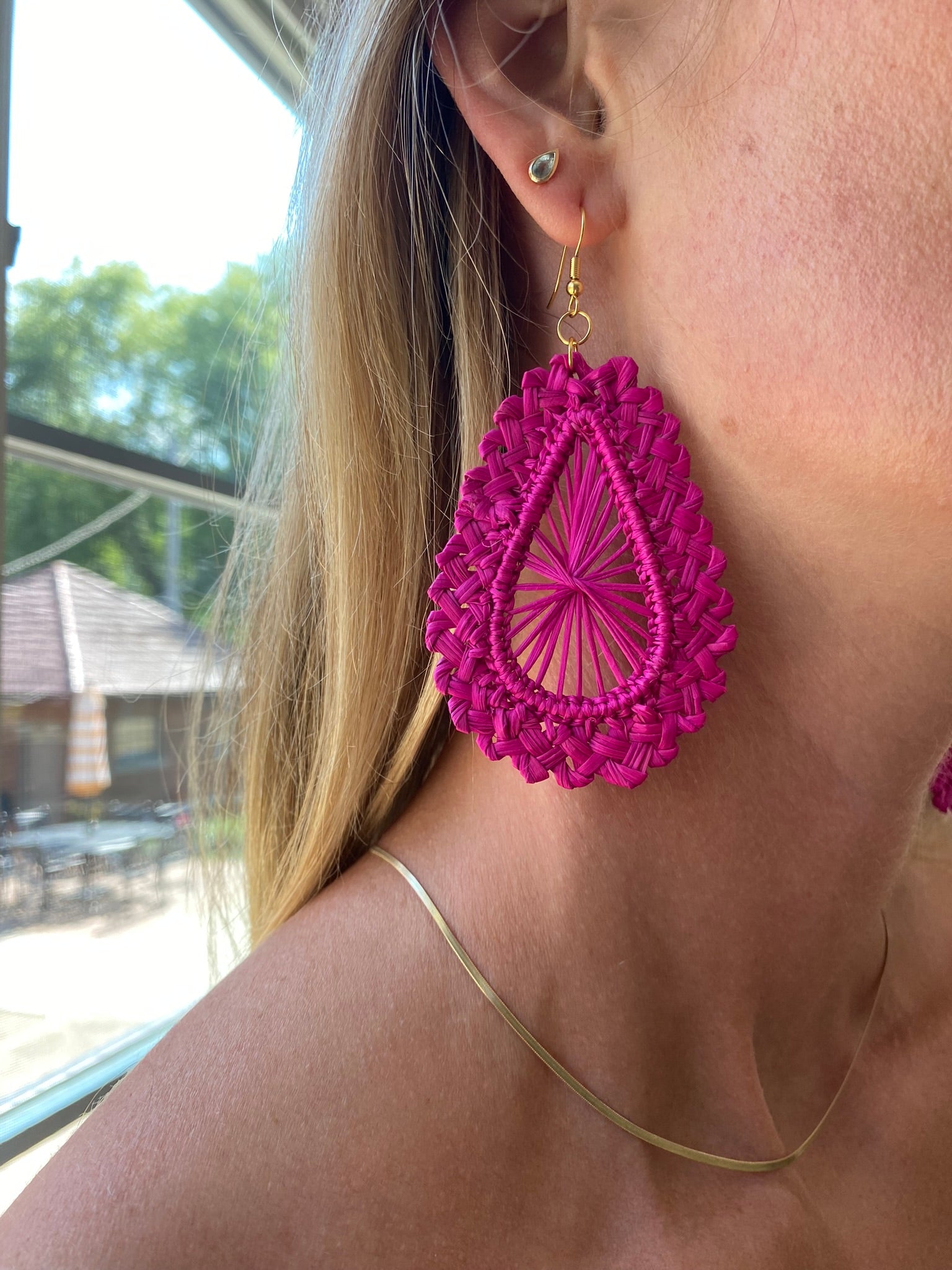 Our tear drop wise earrings are handwoven by professional women weavers in Usiacuri, Colombia from sustainable iraca palm. All our accessories are made by independent women entrepreneurs who weave full time and are paid a fair wage.